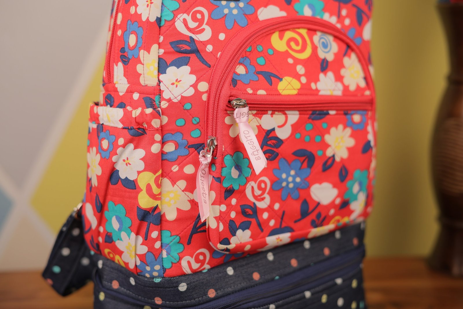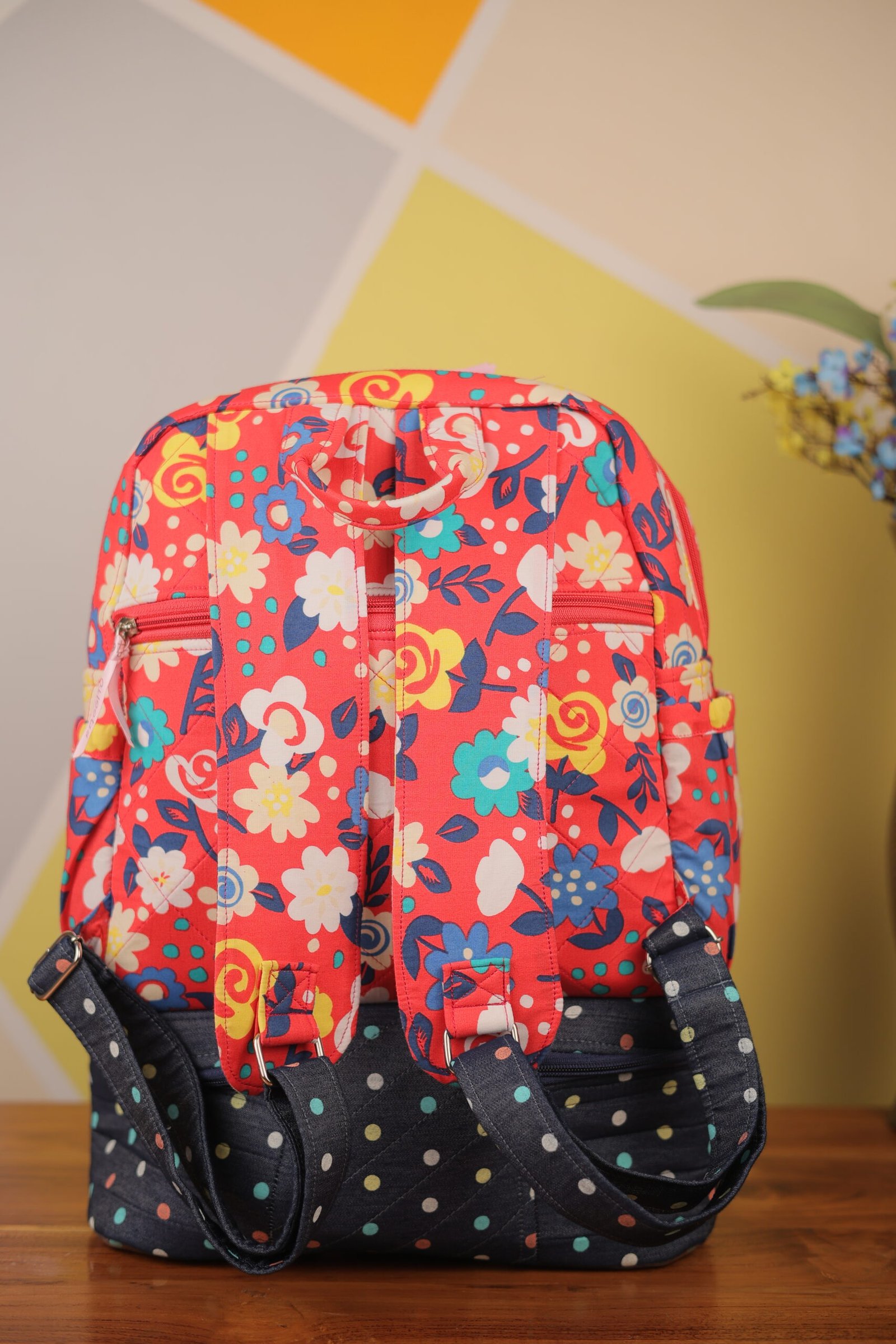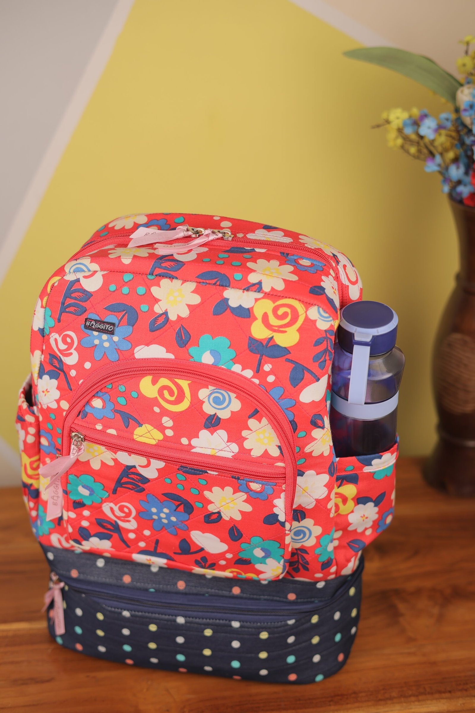The Baggito Red Floral Backpack is a masterclass in functional fashion. The upper section boasts a cheerful red fabric covered in a lively multi-colored floral print, while the bottom section features a classic navy blue with white polka dots design. This contrasting look is both playful and sophisticated.