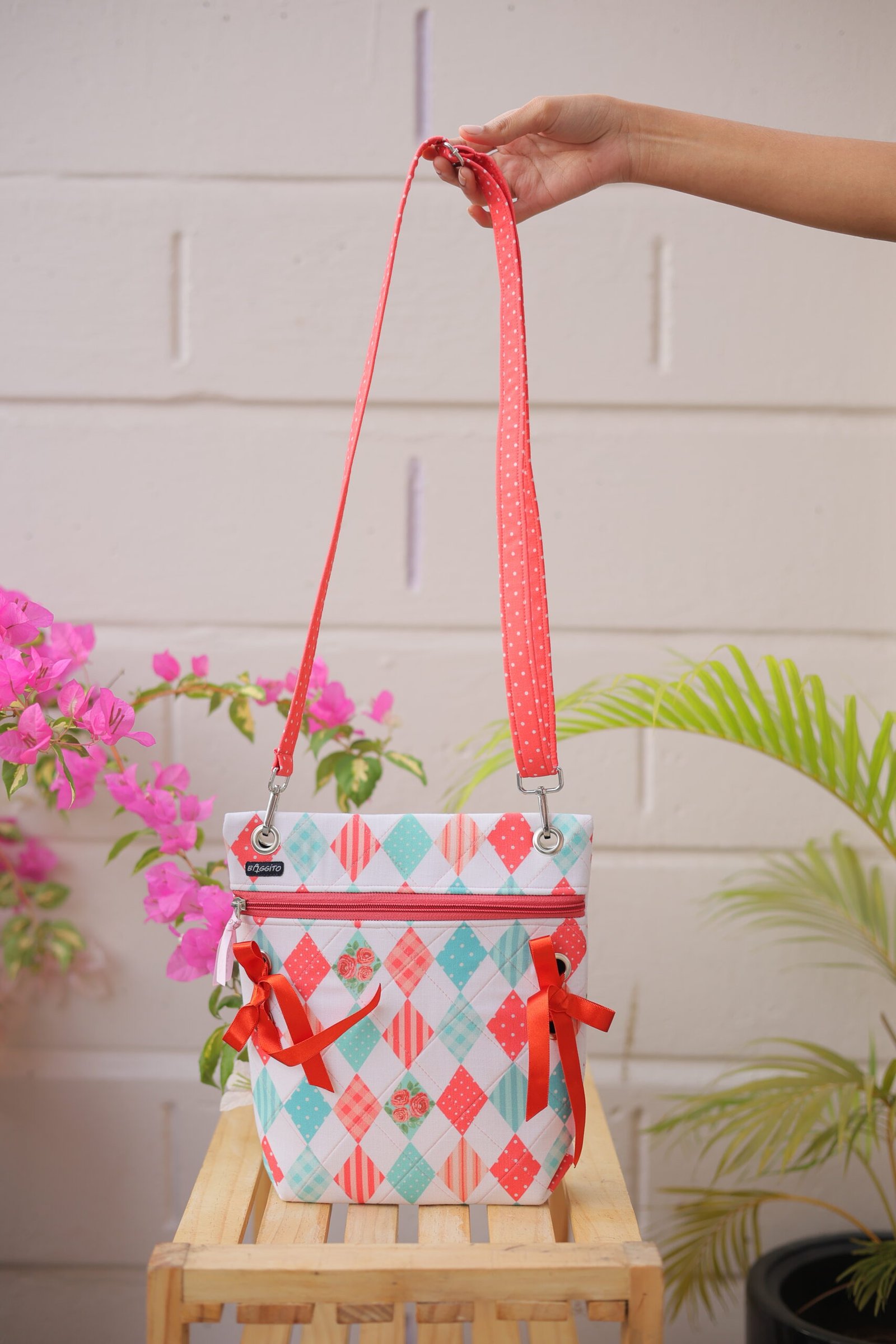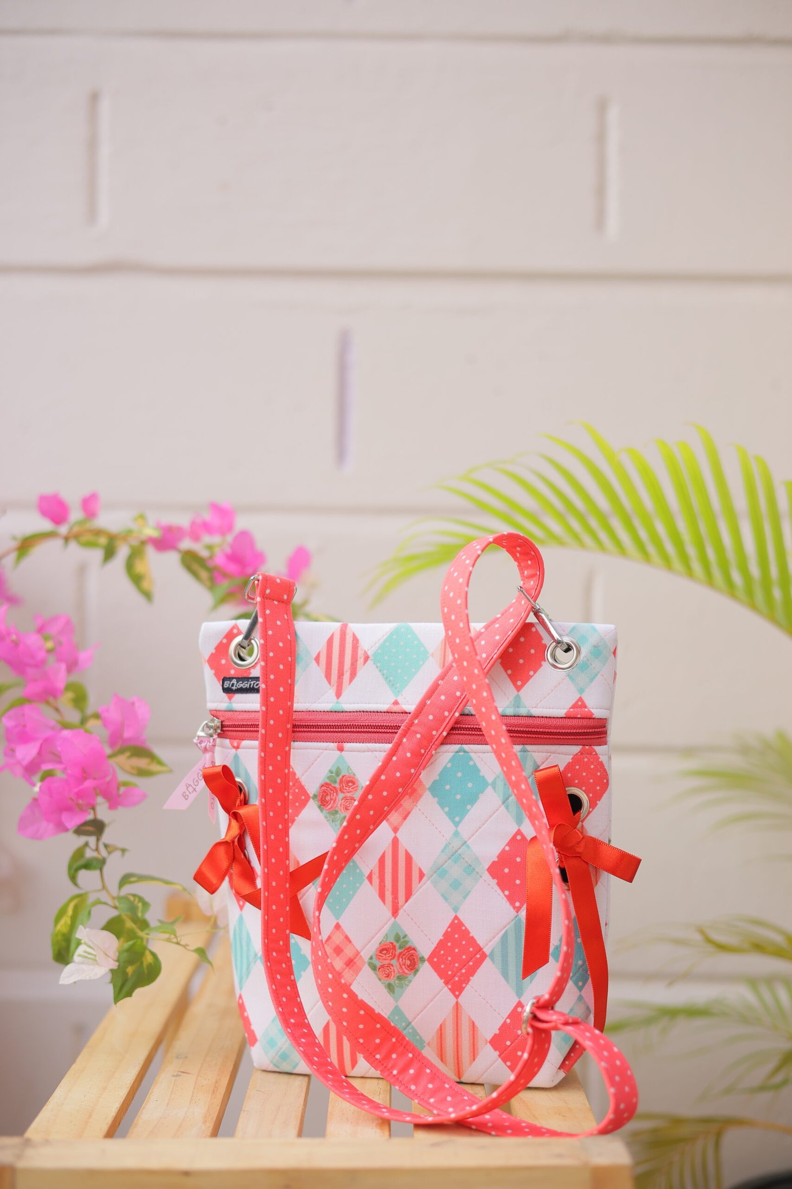 Add a touch of sweetness to your outfit with the Baggito Floral Argyle Quilted Sling Bag. Featuring a charming pink and teal argyle print with rose details, this bag includes playful ribbon bows, a front zipper pocket, and an adjustable polka dot strap for comfortable wear.