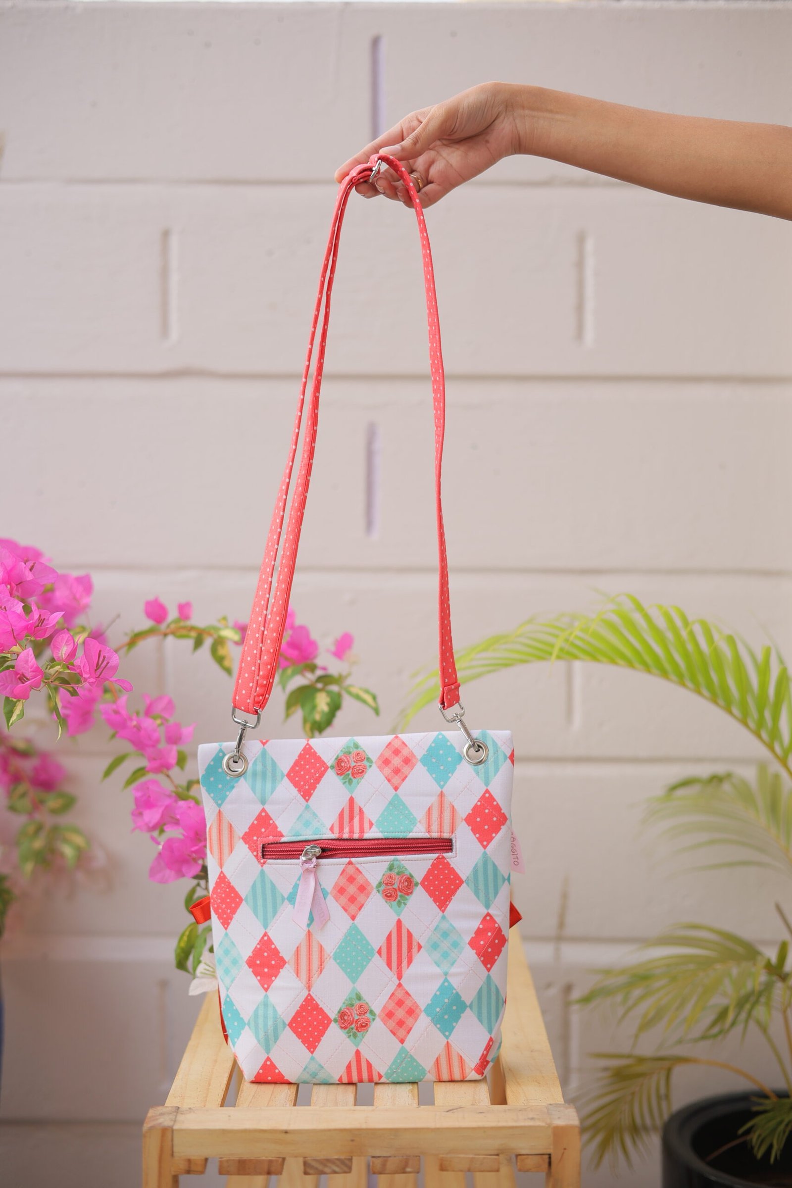 The Baggito Pink & Teal Diamond Sling Bag is a delightful accessory that blends classic patterns with feminine flair. The bag features a white background decorated with a diamond (argyle) pattern in shades of salmon pink and teal blue. Inside the diamonds, you will find intricate details like miniature roses, polka dots, and stripes, creating a whimsical, patchwork-inspired look.