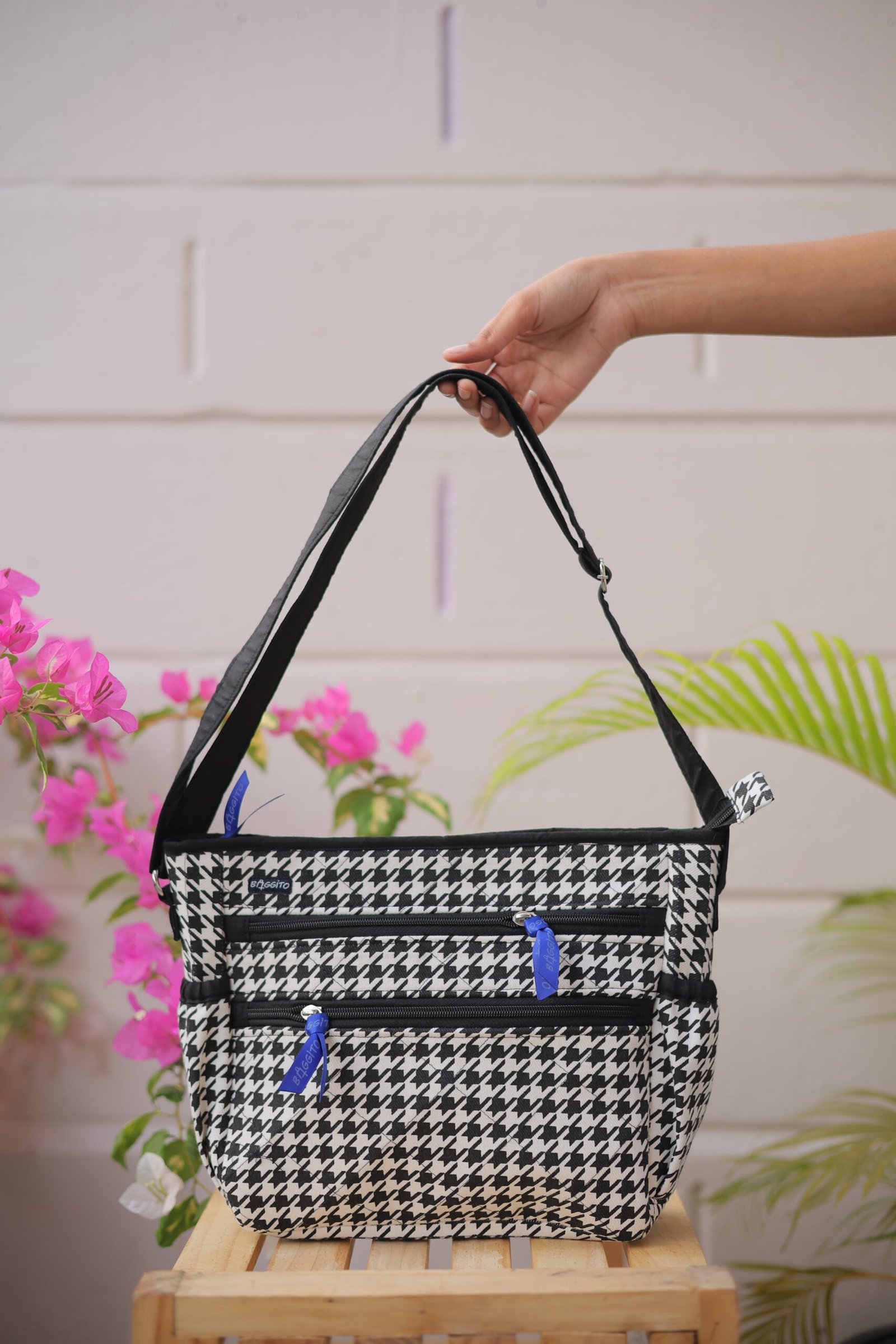 Step out in timeless style with the Baggito Houndstooth Crossbody Bag. This sophisticated purse features a classic black and white houndstooth pattern, multiple zippered pockets for superior organization, and bright blue zipper pulls for a modern pop of color.