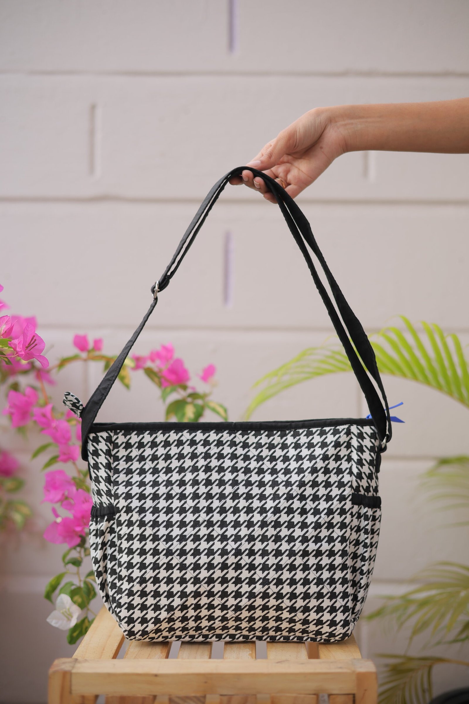 The Baggito Houndstooth Quilted Crossbody Bag brings a touch of classic elegance to your everyday wardrobe. The bag showcases a crisp black and white houndstooth (or dogstooth) pattern, a timeless design that pairs perfectly with both office attire and casual weekend outfits. The sophisticated monochrome look is playfully accented with bright blue zipper pull ribbons, adding a contemporary twist.