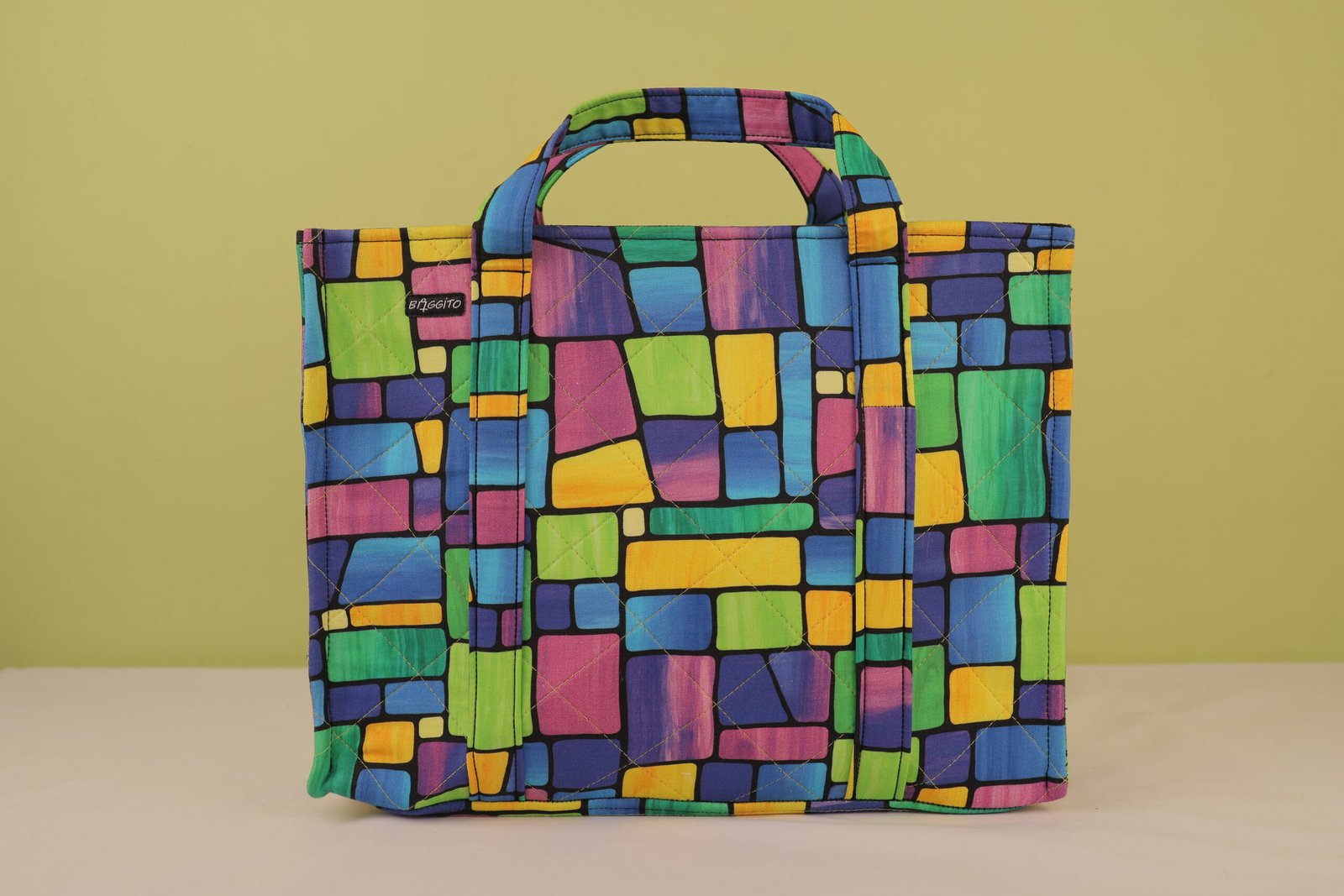 The Baggito Rainbow Mosaic Quilted Tote is a celebration of color and modern design. The bag features a stunning geometric mosaic pattern composed of irregular blocks in bold shades of blue, green, yellow, purple, and pink, outlined in black to create a striking “stained glass” effect. It is a statement piece that instantly brightens up any ensemble.