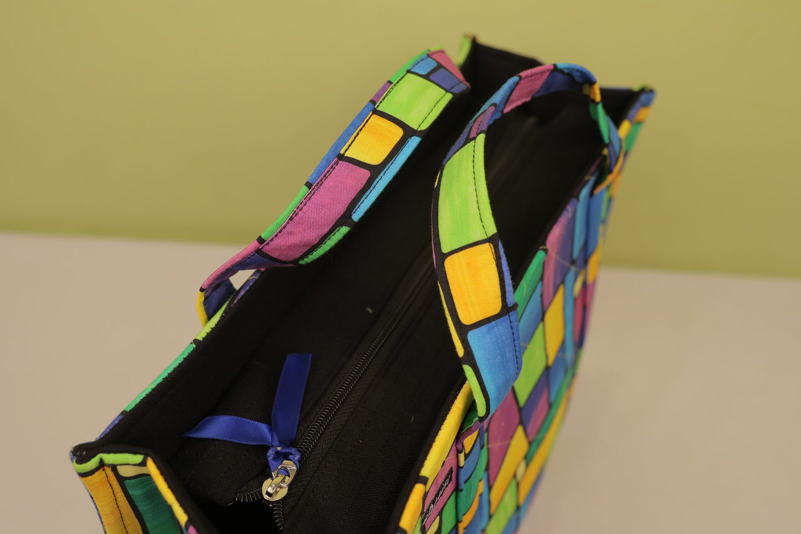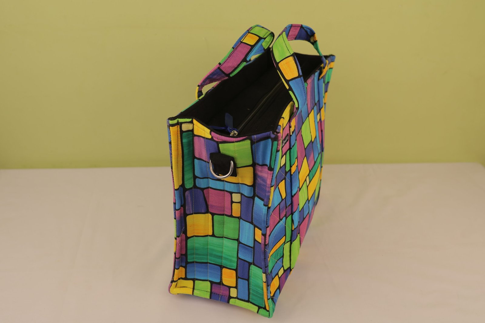 Carry a masterpiece with the Baggito Rainbow Mosaic Quilted Tote. This artistic bag features a vibrant multi-colored geometric block print reminiscent of stained glass. With sturdy top handles and a detachable adjustable shoulder strap, it offers versatile carrying options for work or weekend outings.