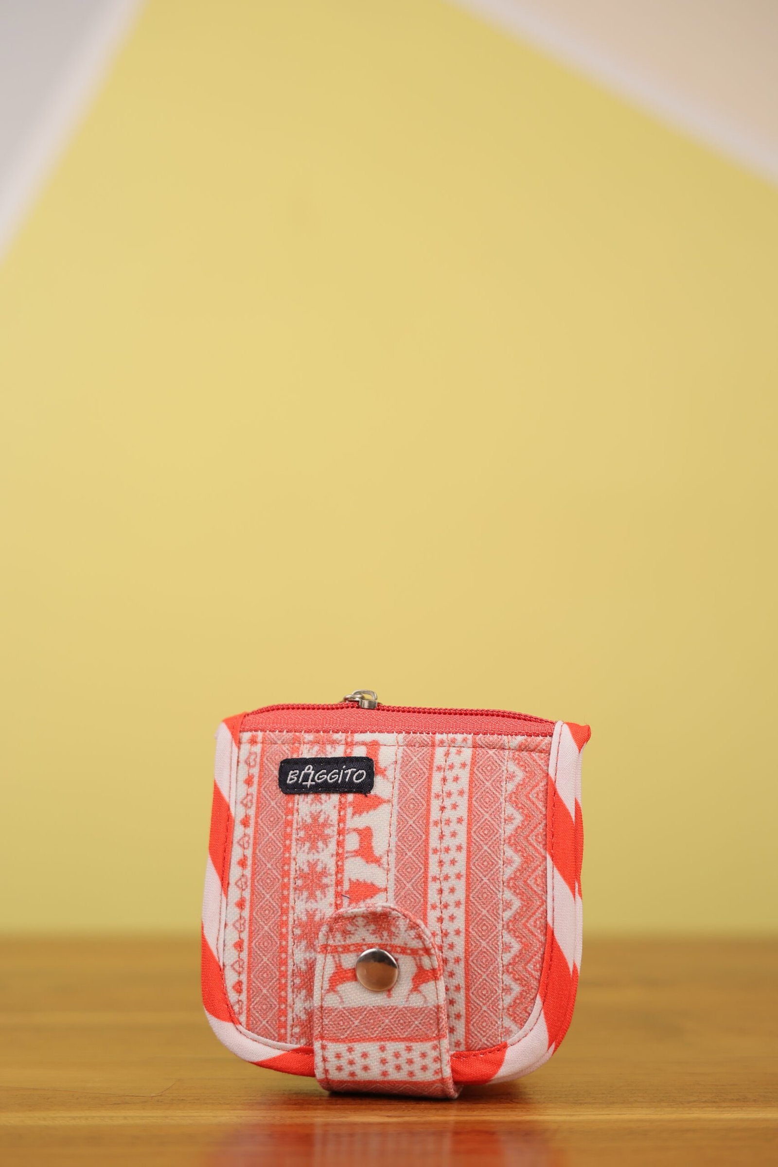 The Baggito Red Nordic Print Mini Wallet packs festive charm into a pocket-sized bumper accessory. The exterior showcases a delightful Fair Isle, Nordic knit pattern with rows of reindeer, snowflakes, and geometric shapes in a warm red and white palette. It is finished with a cute red and white candy-cane striped binding along the edges, enhancing its holiday appeal.