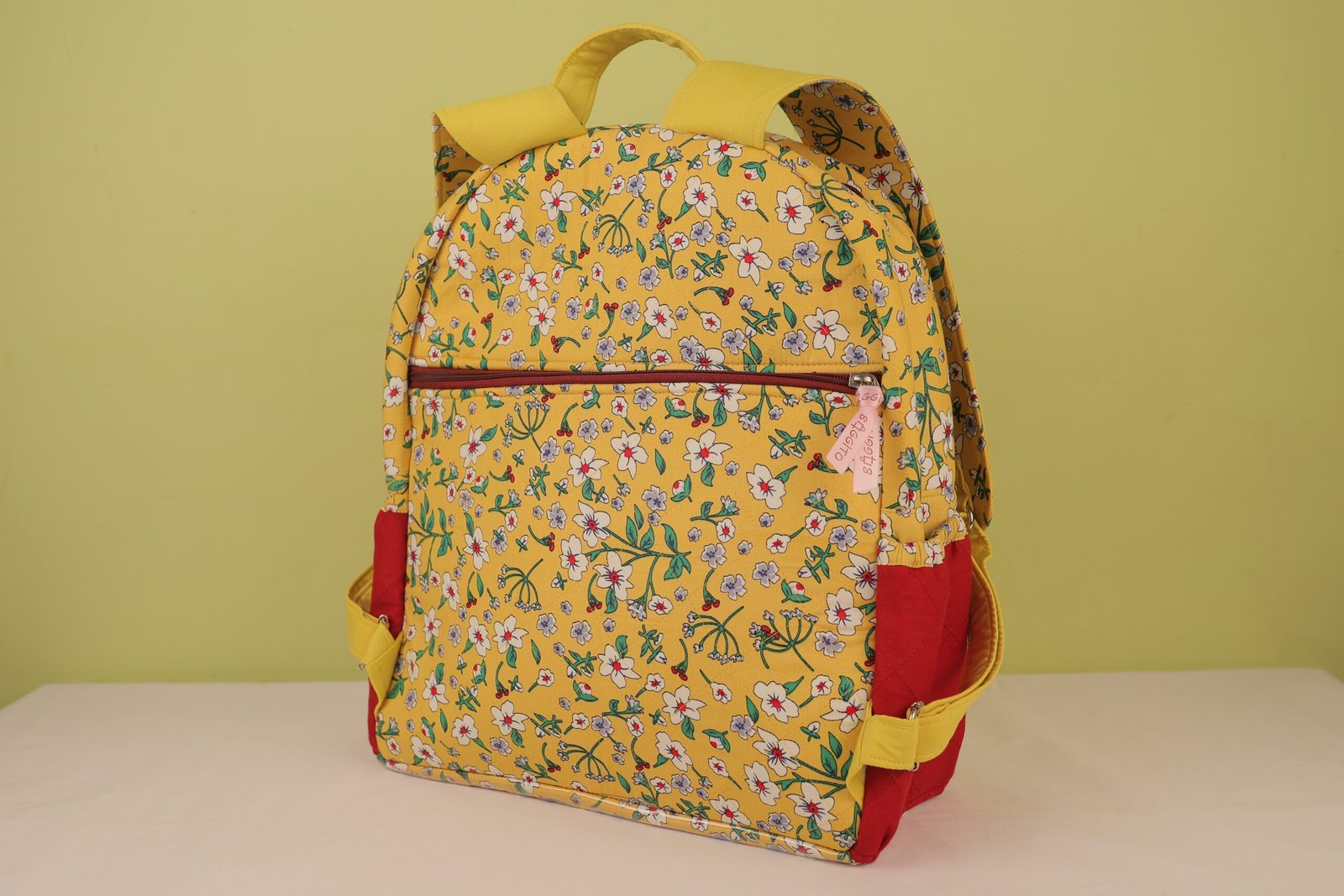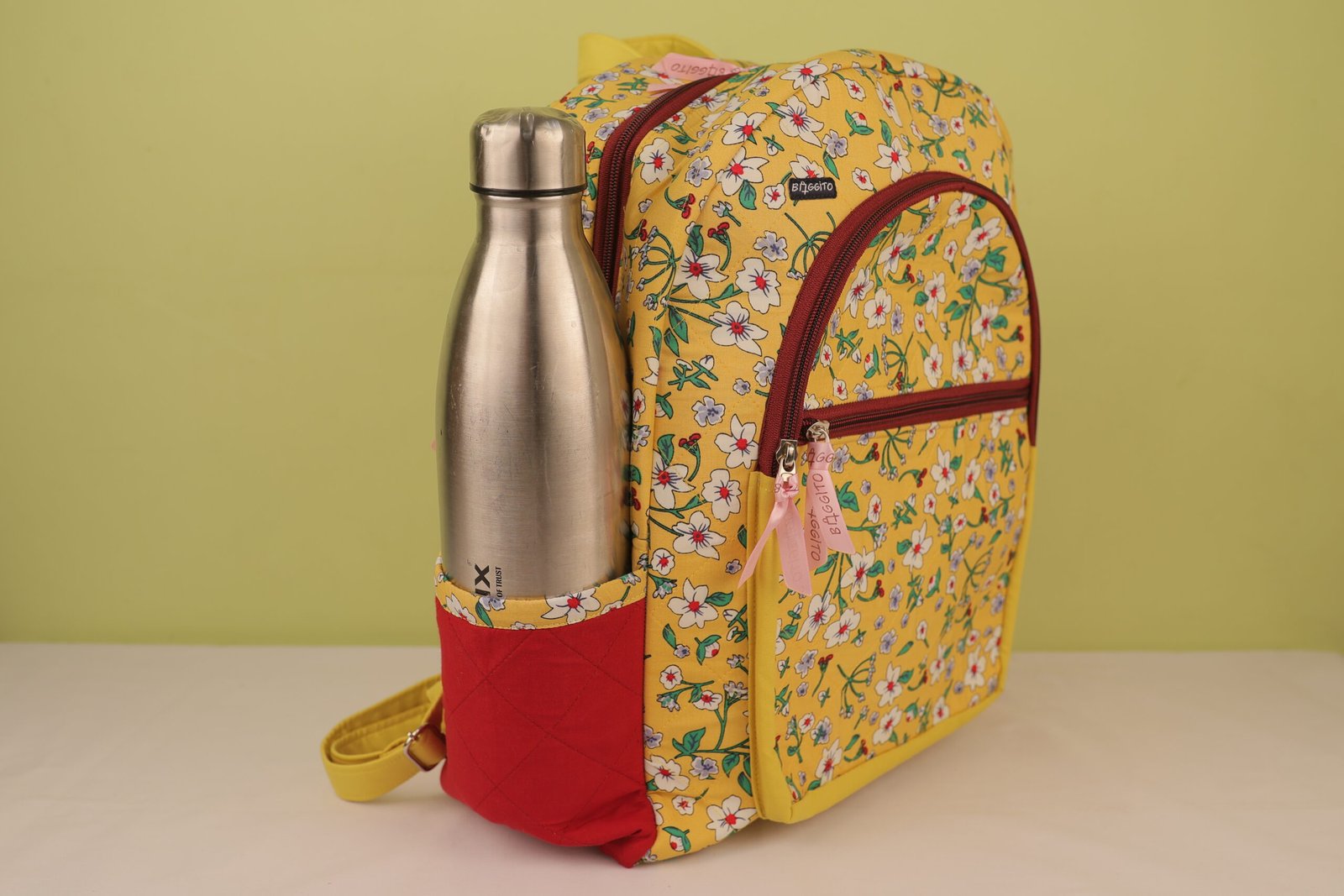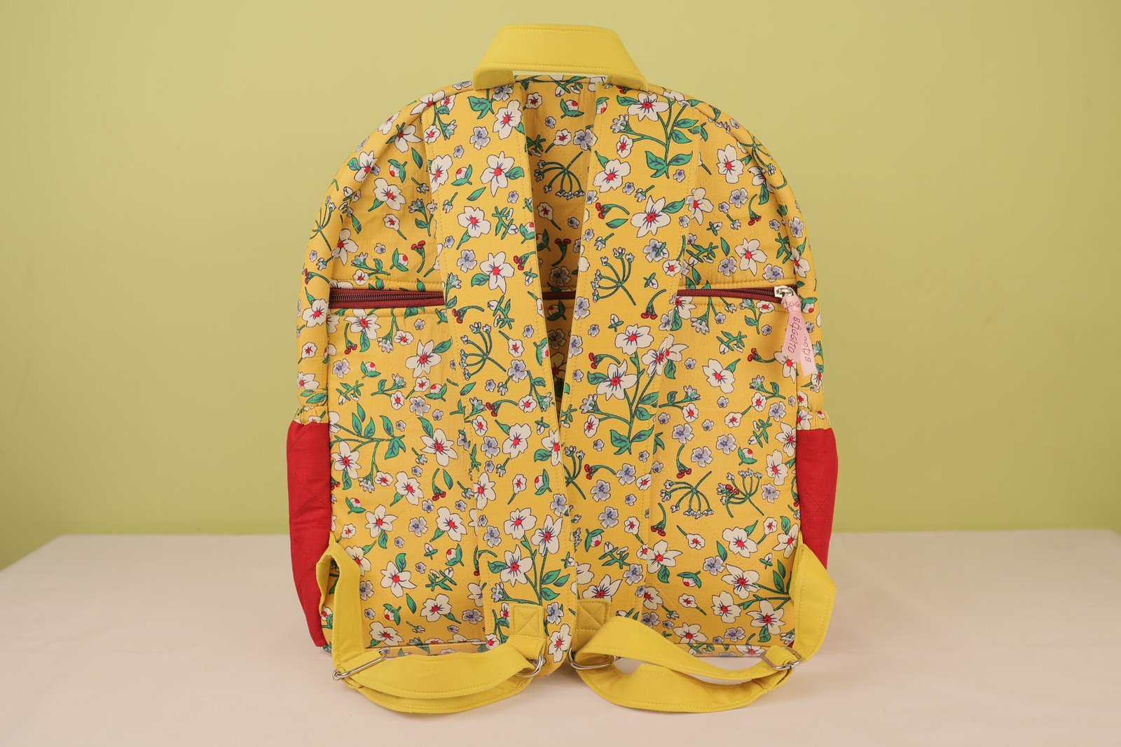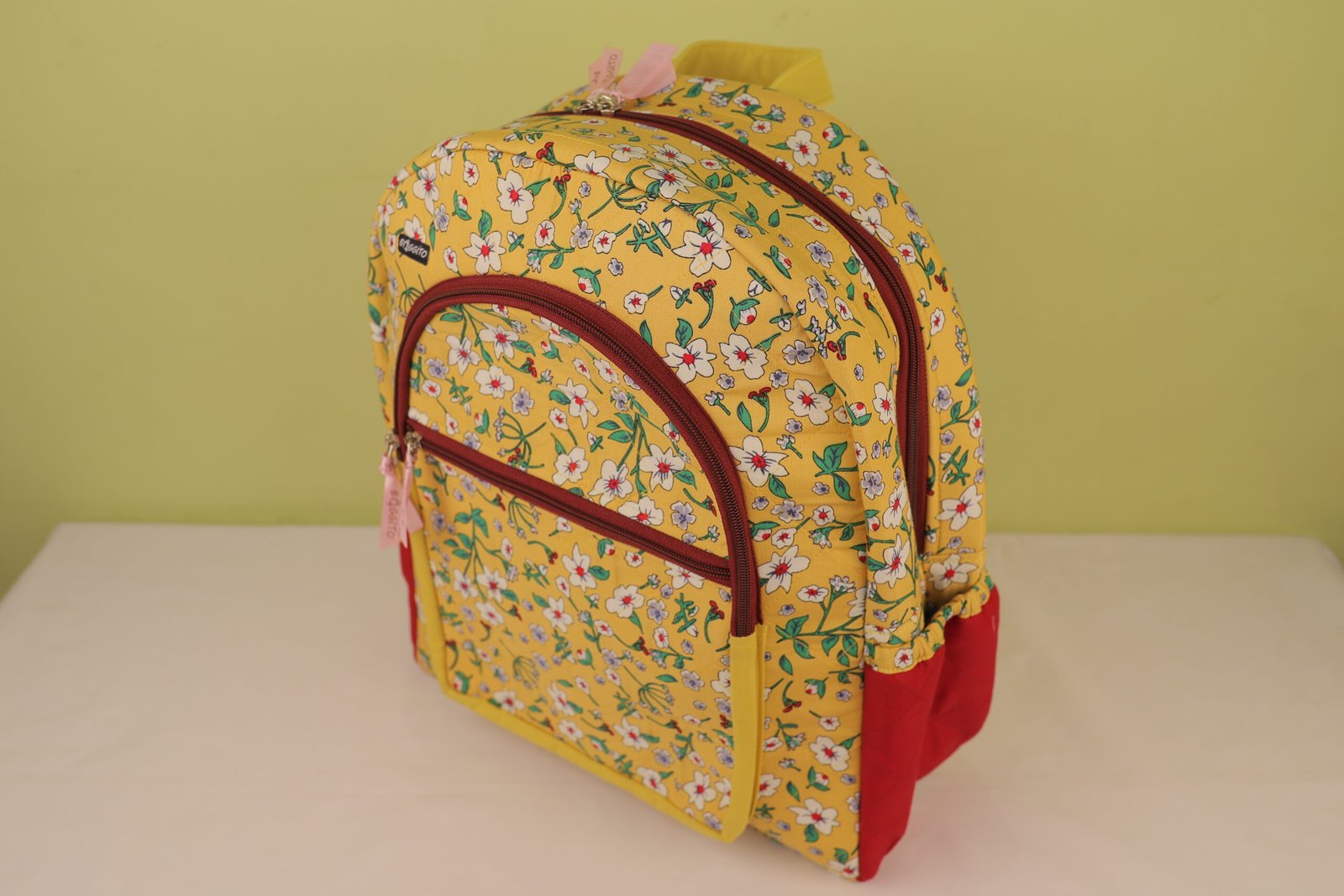 The Baggito Yellow Floral Quilted Backpack is a delightful and practical choice for everyone. The backpack is adorned with a vibrant yellow fabric covered in a dainty white and blue floral print with green leaves. Bold red fabric panels on the sides and a rich maroon zipper tape provide a beautiful contrast, making this bag a cheerful statement piece.